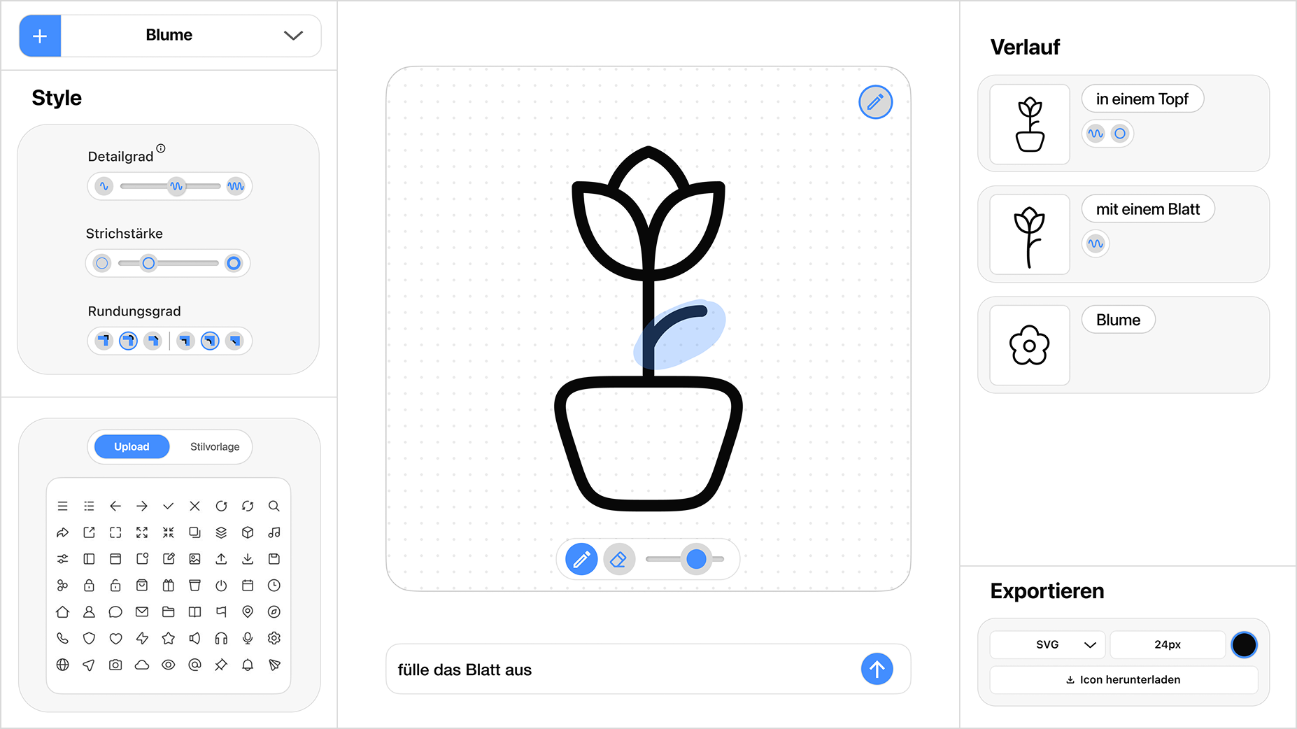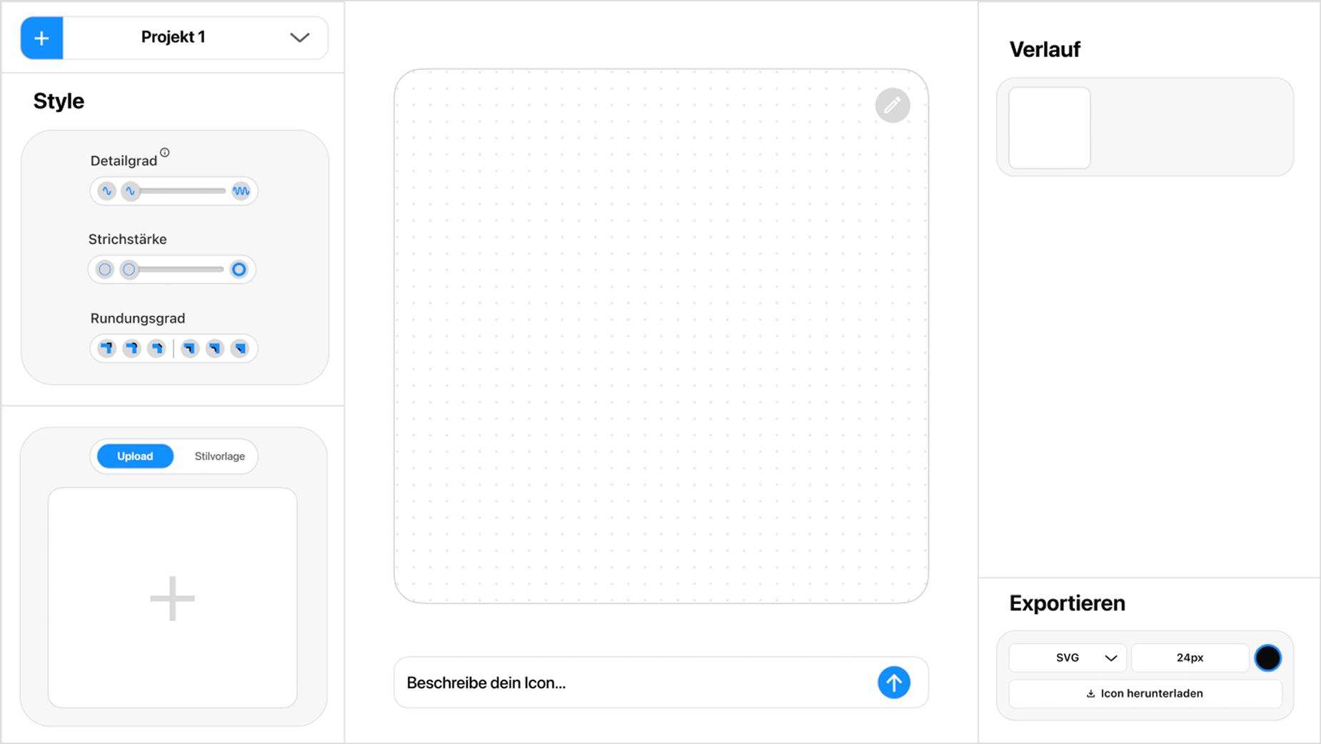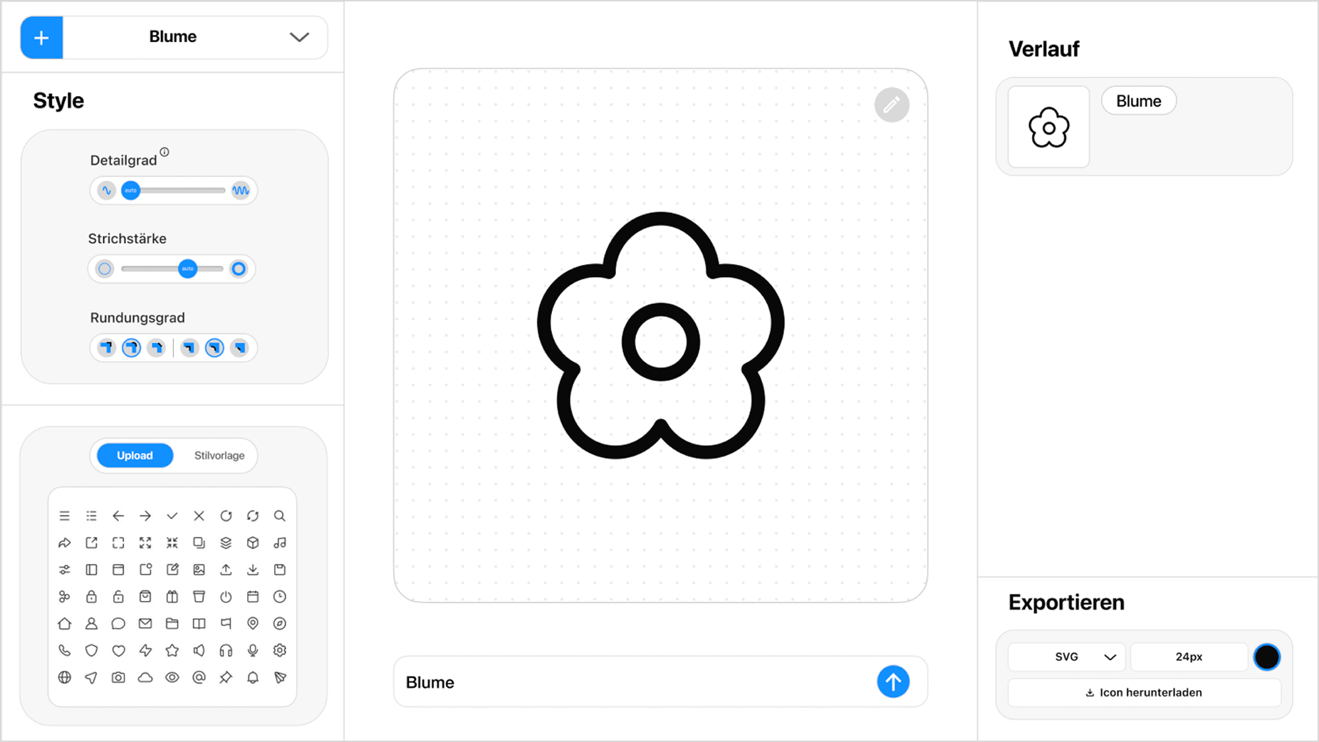 The tool analyzes existing icon sets, automatically recognizes stroke weight, rounding, and level of detail, and generates matching new icons at the push of a button.