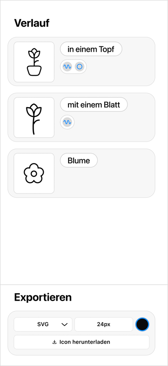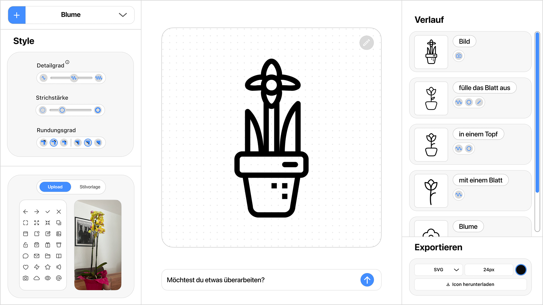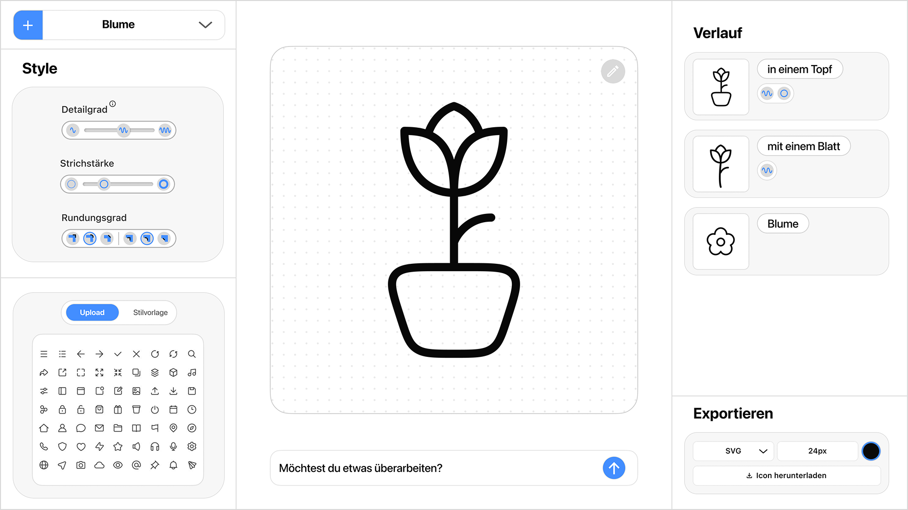 The tool analyzes existing icon sets, automatically recognizes stroke weight, rounding, and level of detail, and generates matching new icons at the push of a button.
